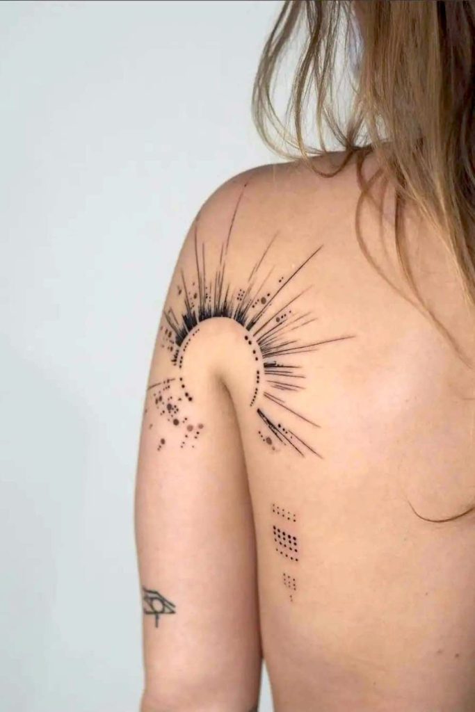 This design works best when the rays follow the shoulder’s curve, so have the artist stencil it while your arm is relaxed in a natural position. If you want it more delicate, shorten the rays and lean into dotwork; if you want more drama, extend a few rays toward the collarbone or upper arm for a wider glow.