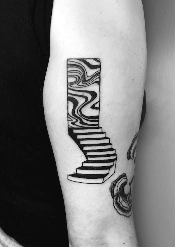 This is the kind of tattoo that makes people stop mid-sentence and stare (in the best way). A crisp black staircase climbs into a rectangular “doorway,” and inside that door is a swirling marble pattern that feels like another dimension. It’s clean, graphic, and slightly trippy—like a minimalist movie poster.