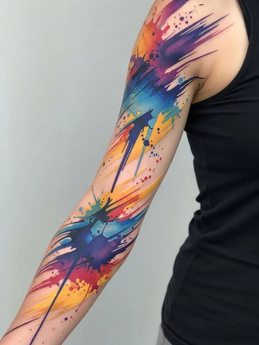 If you want a tattoo that feels like pure confidence, this is it. Those explosive splashes look like a playlist you’d blast on a “new chapter” morning—bright, fearless, and totally unapologetic. It’s the kind of sleeve that makes even a plain tee look styled, because the art does all the talking.