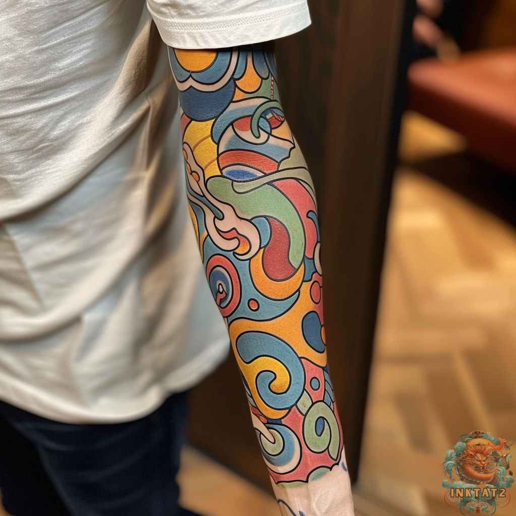 If you’re someone who loves color and wants ideas that read clearly from across a room, this arm placement is perfect. These designs work especially well for men and for women who wear a lot of basics, because the tattoo becomes the styling moment. Ask your artist to keep the outlines crisp and the fills saturated so the palette stays clean over time—think strong edges, even color packing, and careful spacing so the swirls don’t blur together.