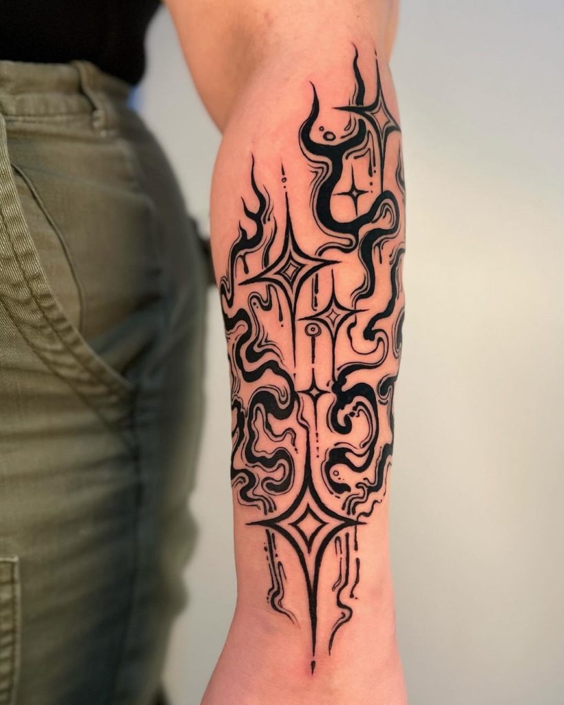 This one feels like wearing movement—like ink caught mid-dance. The flowing lines curl and glide around the arm in a way that’s strangely calming, almost like watching waves roll in when your brain won’t stop buzzing. It’s bold without shouting, and it gives that quietly artsy, “Yes, I know exactly who I am” energy.
