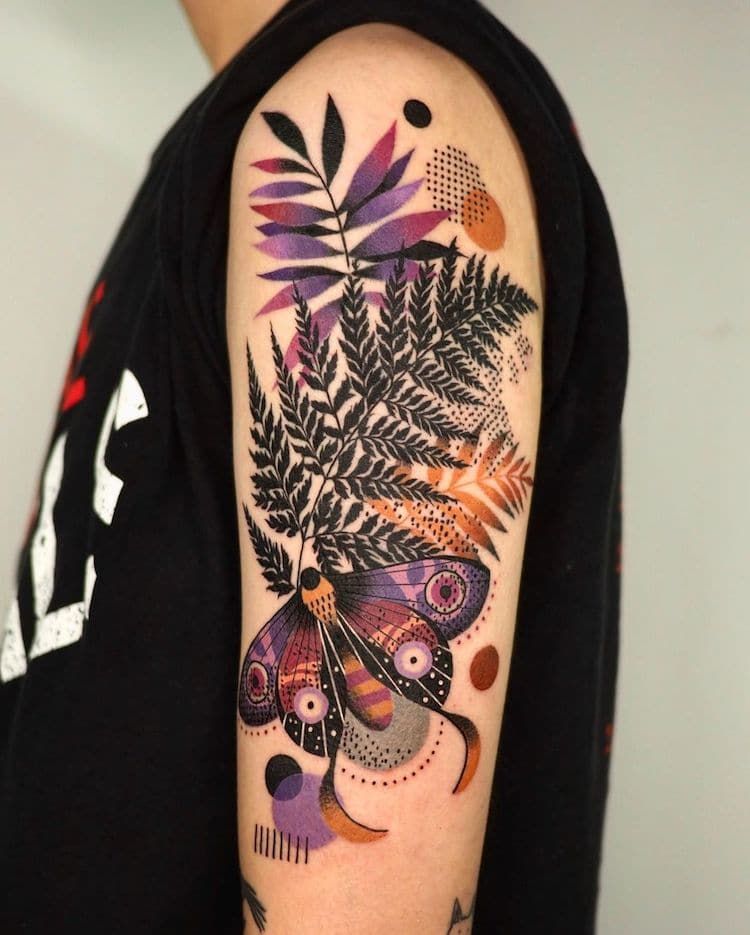 Compared to a traditional floral tattoo, this collage style feels more modern because it mixes realistic elements with abstract shapes and color blocks. If you want it to stay crisp, keep the botanical details in fine lines and let the bolder shapes carry the contrast. It works beautifully as a half sleeve or full sleeve, especially if you leave breathing room so every element stays readable.
