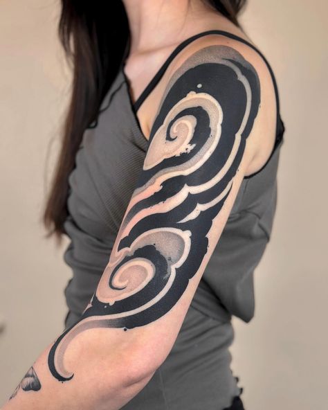 There’s something insanely chic about this one—like a storm cloud that learned manners. The soft, curling shapes feel calm and mysterious, and the contrast gives it that expensive, editorial mood. It’s abstract without being random, and the way it hugs the upper arm makes it feel like it was always meant to live right there.