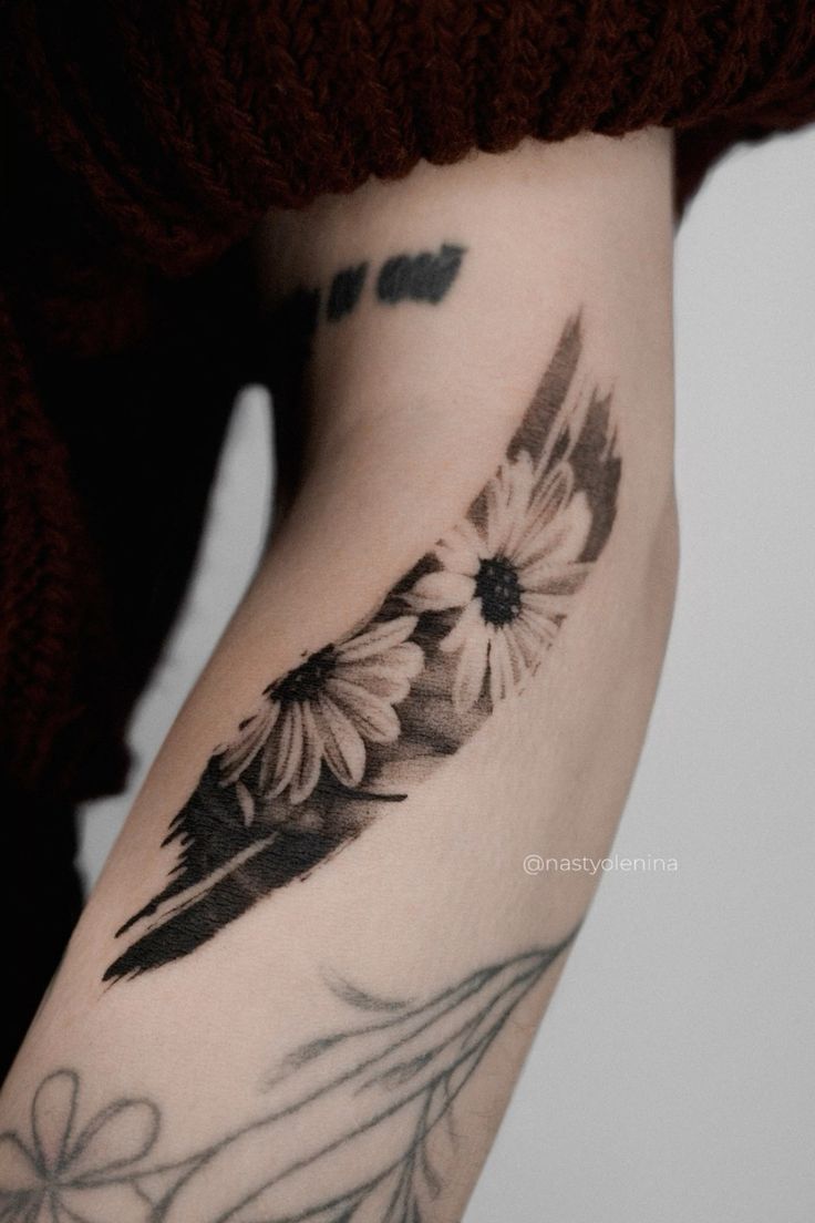 This floral piece feels like a little daydream that hit the skin at full speed—in the best way. The petals look soft and familiar, but that rough, painterly sweep underneath makes it feel modern and a bit rebellious. It’s the perfect “pretty, but not precious” moment, like you’re wearing flowers with your boots and you know exactly what you’re doing.
