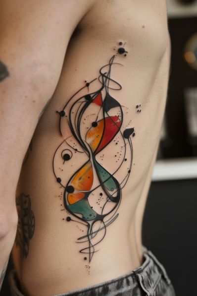 This tattoo is pure elegance with a twist—like music you can see. The ribbon-like lines feel graceful and slightly mysterious, and the little bursts of color make it feel alive, not overly serious. It’s abstract ideas done in a way that still feels personal, like it’s telling your story without spelling it out.
