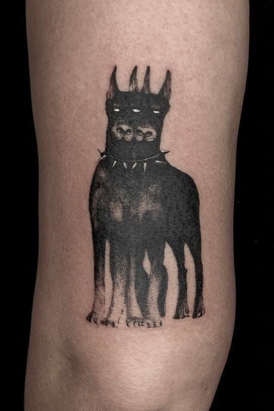 At first glance, this design feels almost like a shadow cast onto the skin. A mysterious dog-like figure stands with sharp ears and glowing eyes, its body fading slightly into darkness. The rough edges give the tattoo a haunting, almost folklore-inspired mood that feels both eerie and fascinating.