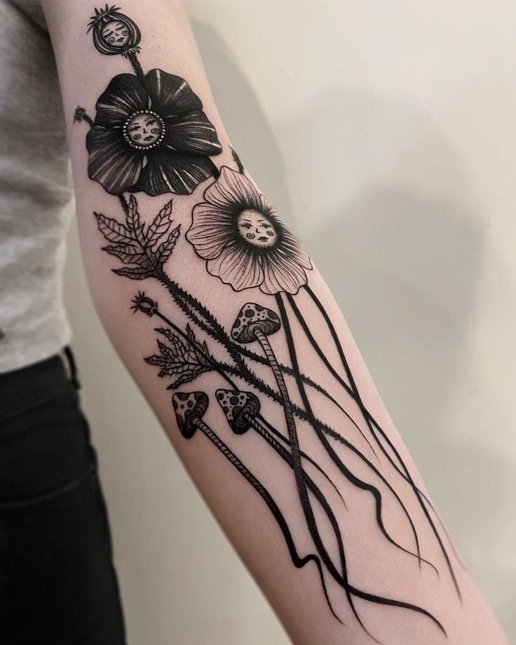 There’s something quietly magical about a tattoo that feels like it grew straight from the earth. This dreamy arrangement of flowers, mushrooms, and delicate stems almost looks like a page from a secret botanical journal. The faces hidden in the blossoms give the piece a surreal twist, blending nature with imagination in a way that feels both whimsical and a little mysterious. It’s the kind of black tattoo art that makes people lean in for a closer look because every detail seems to tell a different story.