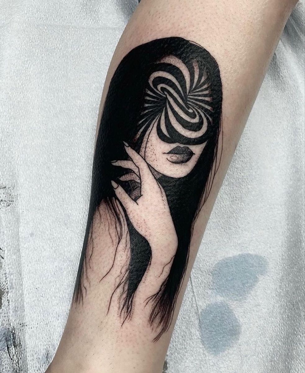 This tattoo has that cinematic, slightly mysterious energy that makes people stop and stare. The portrait of a woman feels elegant and moody, but the hypnotic spiral covering her eyes instantly adds a surreal twist. It’s like looking into a visual illusion—half portrait, half dreamlike artwork. The long, flowing hair and delicate hand gesture bring a sense of grace that contrasts beautifully with the bold graphic element.