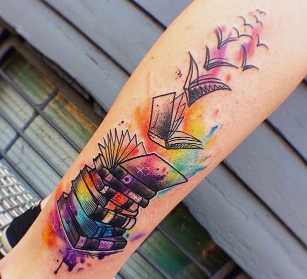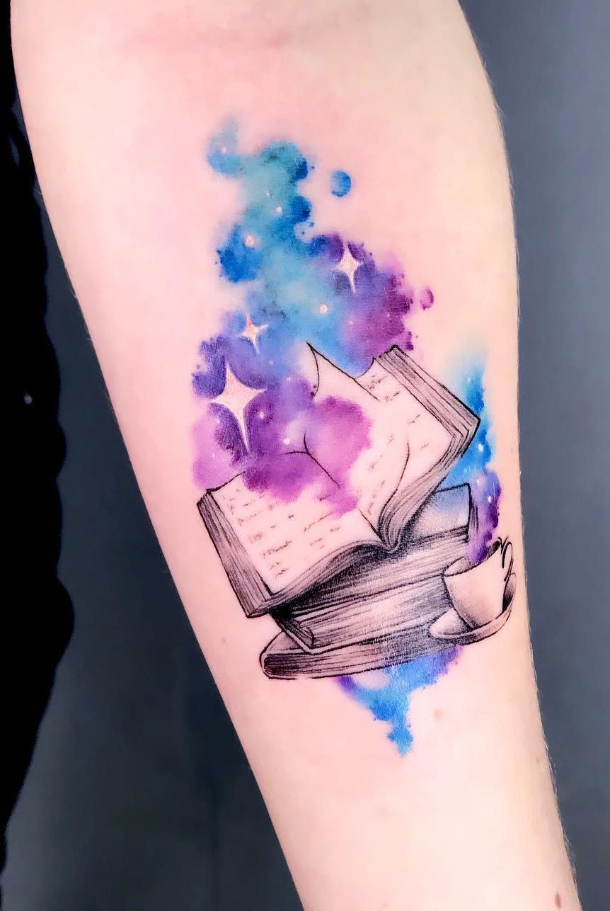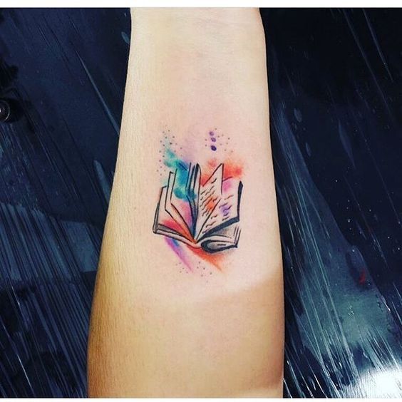 This design is like a splash of joy on the skin: a tiny open book sketched in quick, confident lines, surrounded by little bursts of colorful watercolor. Blues, pinks, and oranges blur together like all your favorite genres bleeding into one another—thriller here, romance there, and a dash of fantasy for good measure. It’s cute and lighthearted, perfect if reading is your happy place and you want something that feels more like a mood than a literal scene.