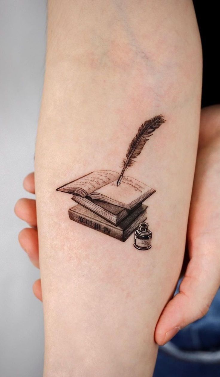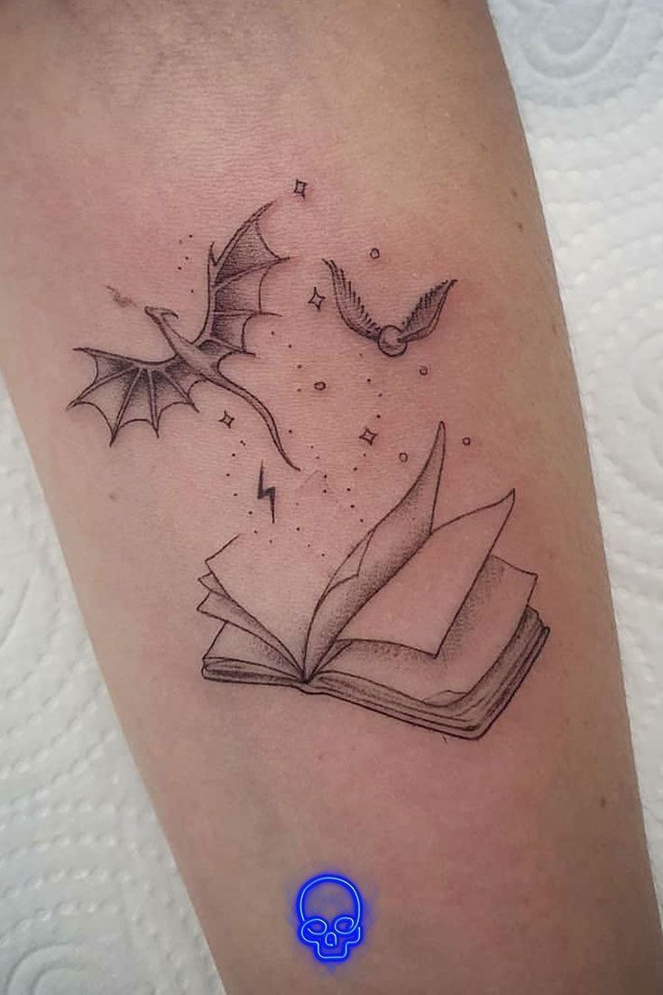 What makes this idea special is how versatile it is. You can scale it down for an ankle or wrist or stretch it slightly for the forearm without losing its lightness. Because the linework is simple, it’s easy to customize with your favorite quotes, a date, or even a small fantasy detail like a star or dragon tucked into the spine. It’s a lovely first tattoo if you’ve been nervous to commit but can’t stop thinking about book-inspired ideas.