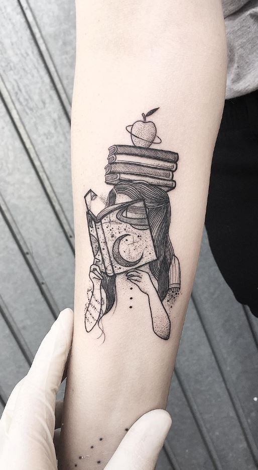 While this tattoo may seem complex, it is very simple to manage over time. The main outline keeps it structured, while the smaller details of the books are secured within the silhouette to avoid major fading that may distort the concept. The tattoo is on the forearm, which aesthetically aligns with the natural arm line, and it can serve as the anchor for a collection of book-themed designs if you want to create a partial sleeve. Moreover, the clear outer shape of the tattoo allows it to match with simple t-shirts and more formal attire, which is a reminder that being well-read is always in fashion.