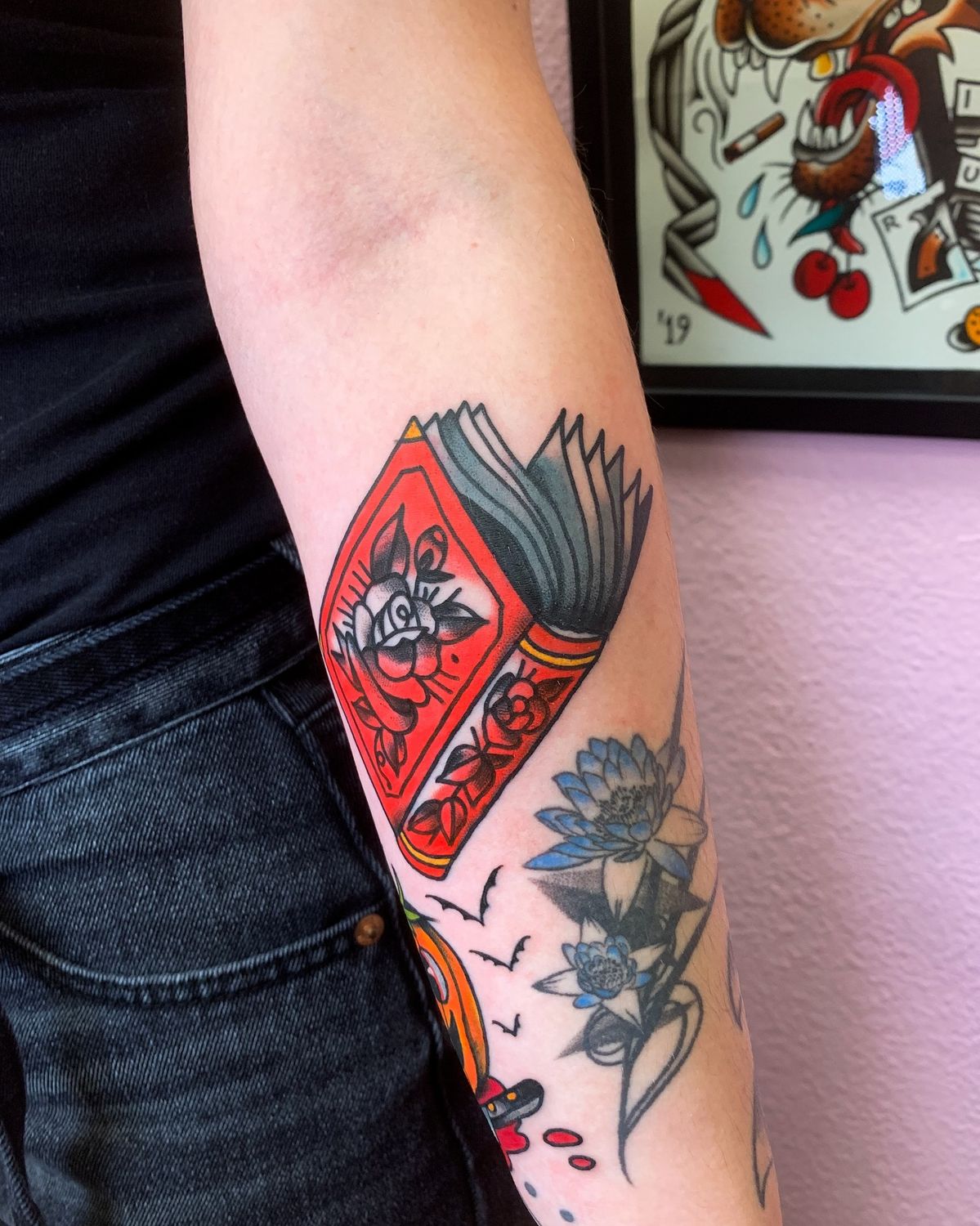 What makes this design special is how it merges classic tattoo traditions with softer, bookish symbolism. It’s brilliant for women who want designs that don’t fade into the background; the saturated colors and strong outline keep it readable on any skin tone. Because the book runs along the forearm, it elongates the arm beautifully and pairs well with existing floral or Gothic pieces if you’re slowly building a sleeve or for women’s sleeve ideas around your favorite stories.