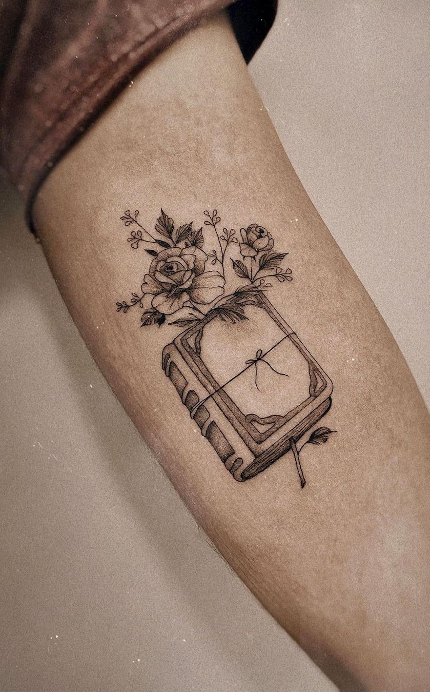 Styling-wise, this tattoo loves a rolled sleeve and a simple bracelet or watch. The diagonal angle of the book flatters the arm, giving movement without needing color, and the floral details pair beautifully with delicate jewelry instead of competing with it. If your wardrobe leans toward muted tones, linen, denim, and leather, this design will slide right in as an everyday accessory that still feels special.