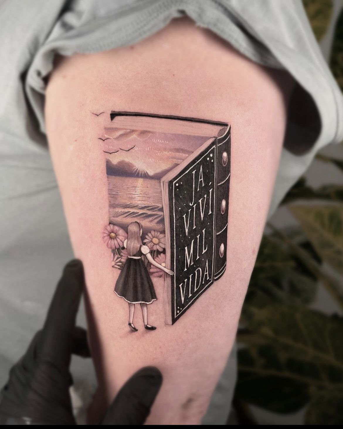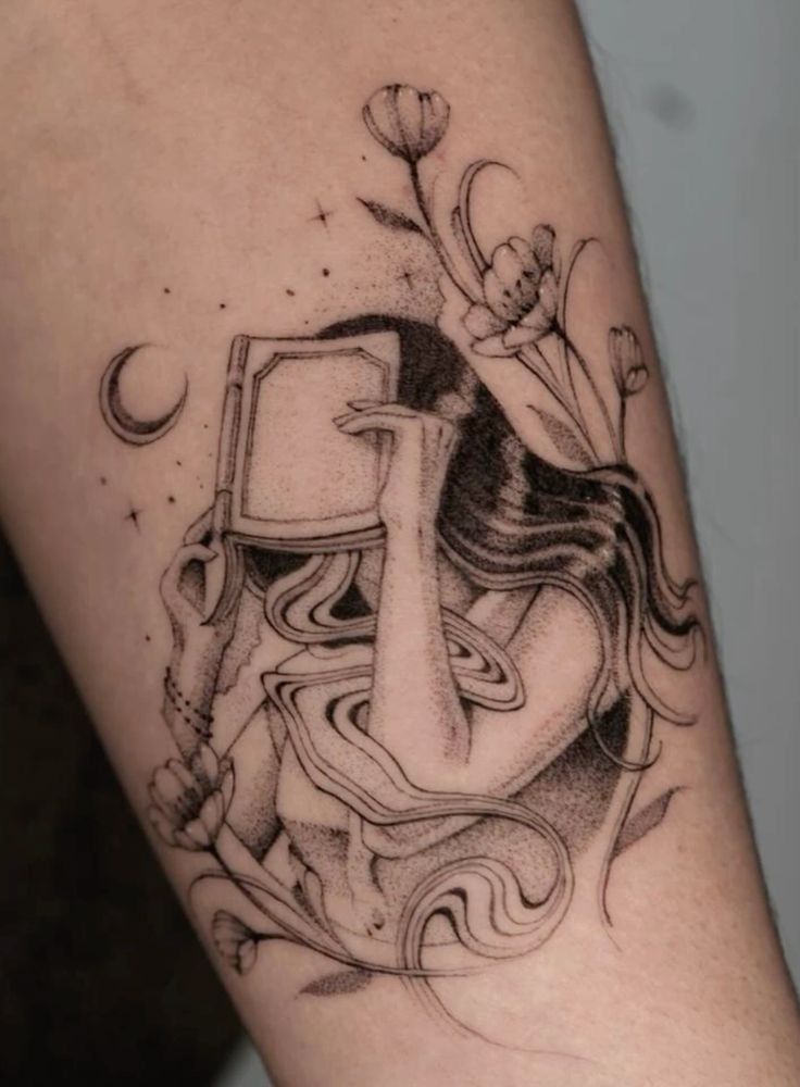It is beautifully rebellious to display your love for books on your skin. For many, reading has gotten us through heartbreak, career changes, and long nights with babies and has kept us company on solo journeys and all the seasons in between. A book tattoo can be a little secret acknowledgment to the chapters you’ve survived and the new ones you still plan on writing. It serves more than the purpose of decoration and serves as a reminder that your inner world is very much alive.