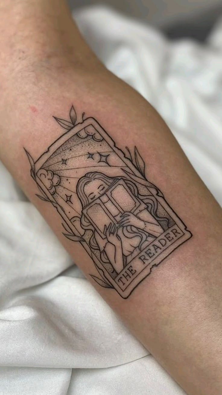 There’s a deep emotional satisfaction associated with this tattoo if you’ve ever experienced the feeling of being “seen” by particular fictional characters. This works particularly well for women who, without relying on the usual clichés, wish to honor their inner self and wisdom. Whether it’s on the forearm or the calf, it’s a personal totem—almost as if you’re drawing your own card before facing the next major life chapter. It serves as a wonderful reminder that, no matter what your age, you are both the author and the reader of your own story.