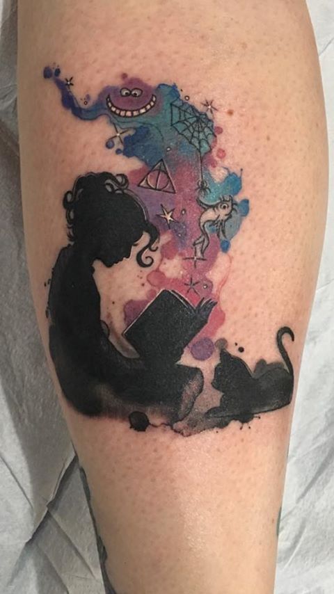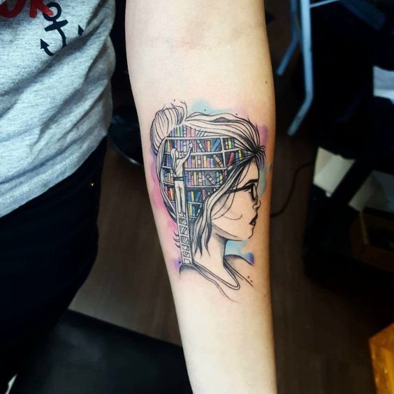 Unlike more minimalist designs, this one fully embraces a story and a feeling. The solid black core translates to a tattoo that will stand the test of time, and the delicate watercolor touches will allow your tattoo artist to acknowledge different fandoms—from Harry Potter to jungle adventures—without copying a single cover. For women, it’s a collage tattoo to beautifully celebrate grandchildren, pets, or past versions of yourself who fell in love with reading, all at once.
