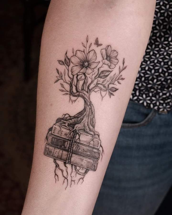 If you’ve been waiting for a tattoo that feels like a true life symbol, this one is a powerful motivation to finally book the appointment. The elongated shape flatters the forearm and can easily be expanded upward or downward into a larger piece as new ideas take root. Ask your artist for subtle shading on the books and bolder texture in the bark so the design keeps its depth over time, even as your own story keeps unfolding.