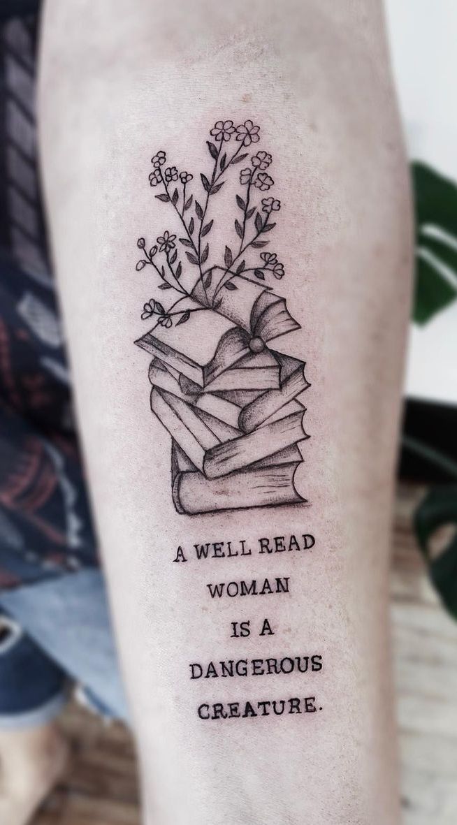 This tattoo is a love letter to every chapter you’ve lived and read: a loose stack of books topped with wildflowers and the line “A well-read woman is a dangerous creature” set crisply beneath. It feels powerful without being loud, a perfect mix of romance and rebellion. The fine line shading keeps the books soft and feminine, while the quote reads like a quiet manifesto for women who know knowledge is its own kind of magic.