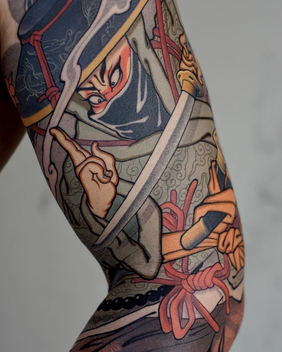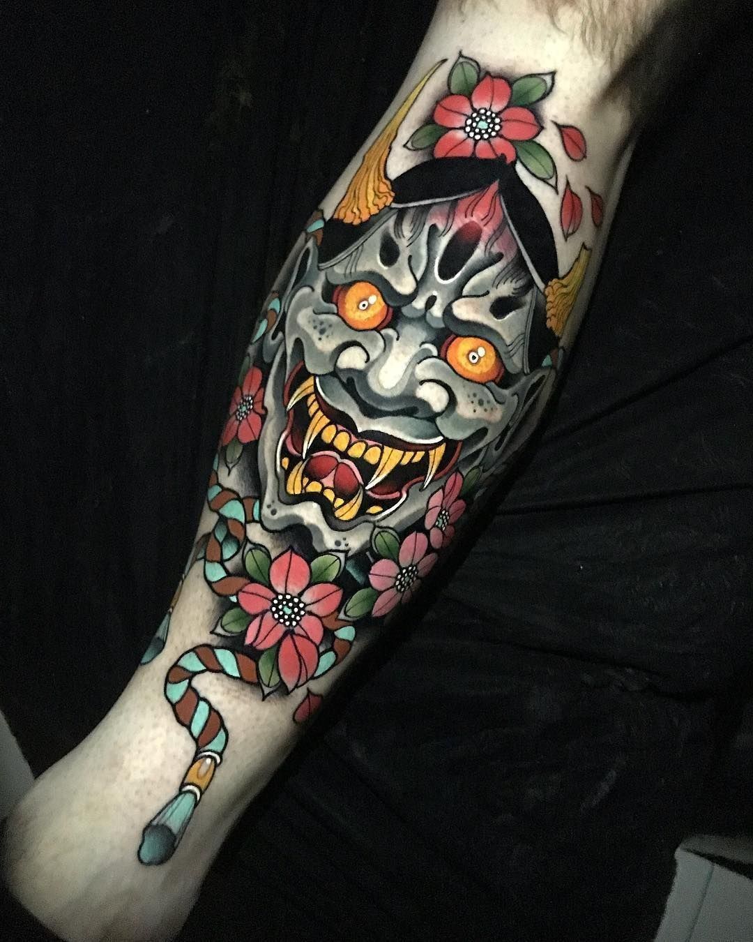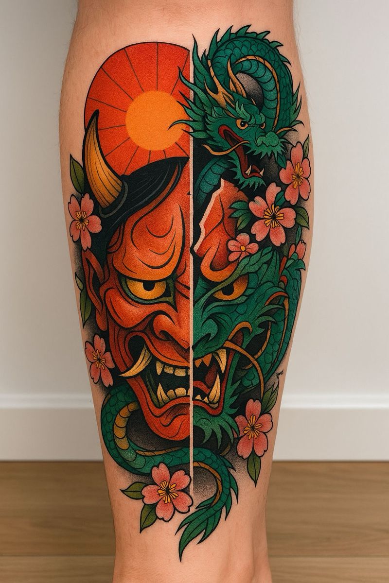The emotional payoff is huge: you put this on your leg, and suddenly you walk differently—more confident, more grounded, more “I’ve arrived.” This works especially well for people who love crisp lines and high-contrast color, because the oni mask colored palette stays loud and clear. If you’re thinking of a full leg later, this layout can expand beautifully with waves or florals. Just make sure your artist nails symmetry and saturation—this is not the time for “good enough.”