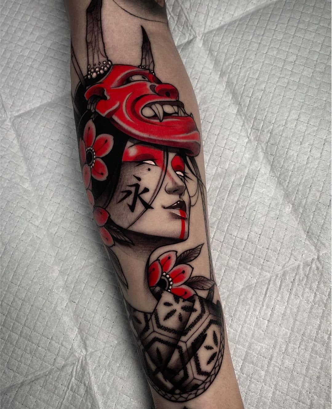 This is the kind of tattoo that makes you look fearless—even if you’re actually a softie who cries at dog videos (no judgment, I’m with you). The oni mask brings the intensity, and the blossoms soften it just enough to feel balanced and stylish. It’s bold, theatrical, and honestly kind of gorgeous in that “I contain multitudes” way. If you’re collecting Japanese tattoo designs that feel unforgettable, this one earns its spotlight.