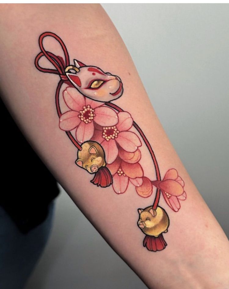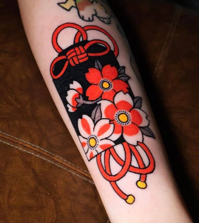 This design feels like carrying a little pocket of good energy with you—bright, protective, and oddly comforting. The omamori-style charm gives it that “personal talisman” vibe, and the flowers make it playful instead of serious. It’s cheerful without being childish, and it has that classic Japanese flash feel that never really goes out of style. If you want Japanese tattoo designs that feel upbeat and meaningful, this is it.