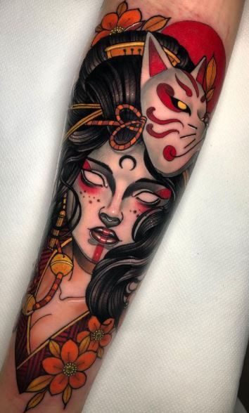 25. Neo-Traditional Geisha With Kitsune Mask