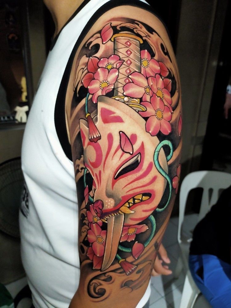 This one is pure joy—playful, pretty, and just a little mischievous. The little kitsune mask vibe feels like a lucky charm you get to carry everywhere, and the soft blossoms keep it sweet and stylish instead of intense. It’s giving “I’m fun, but I’m not to be messed with,” which, honestly, is a very attractive combination. As far as Japanese tattoo designs go, it’s cute with intention.