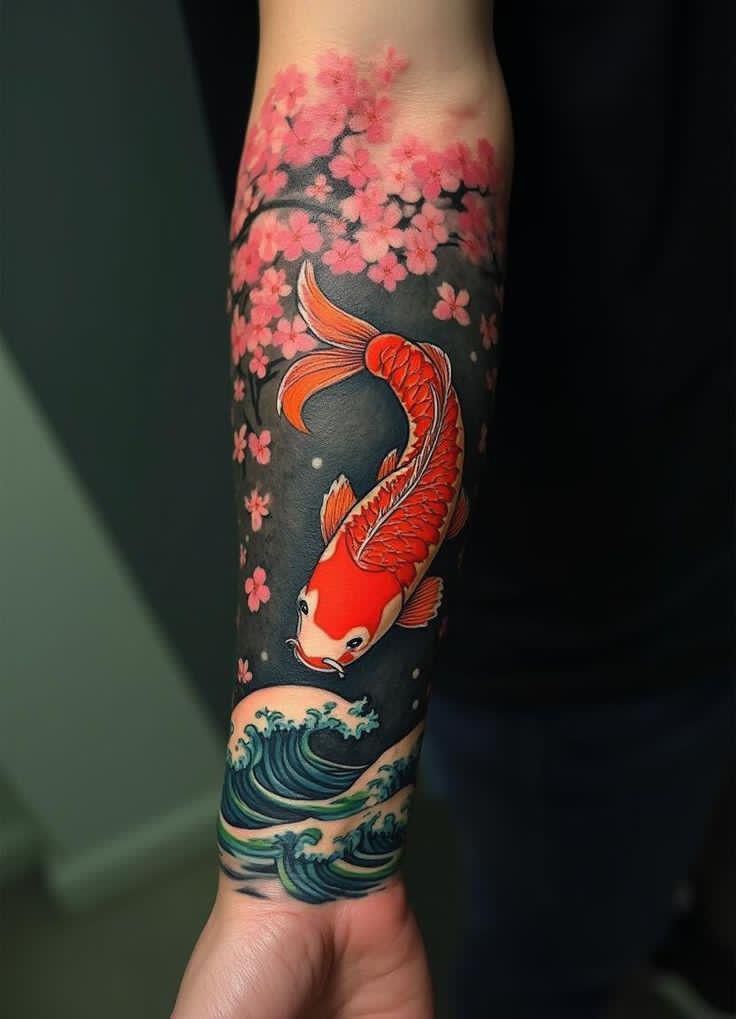 In 2025, this blend of classic imagery with rich, dark backgrounds is everywhere for a reason: it makes colors look brighter and the design look more “finished” from day one. If you’re thinking of sleeve planning, this is a strong foundation because the waves can expand seamlessly into a full sleeve later. Ask for crisp wave crests and clean blossom edges so the pinks don’t get lost over time. And yes—SPF is non-negotiable if you want those blossoms to stay pretty.
