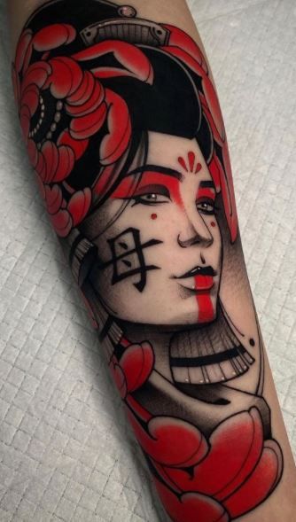 20. Red and Black Geisha Portrait: Neo Traditional Glam
