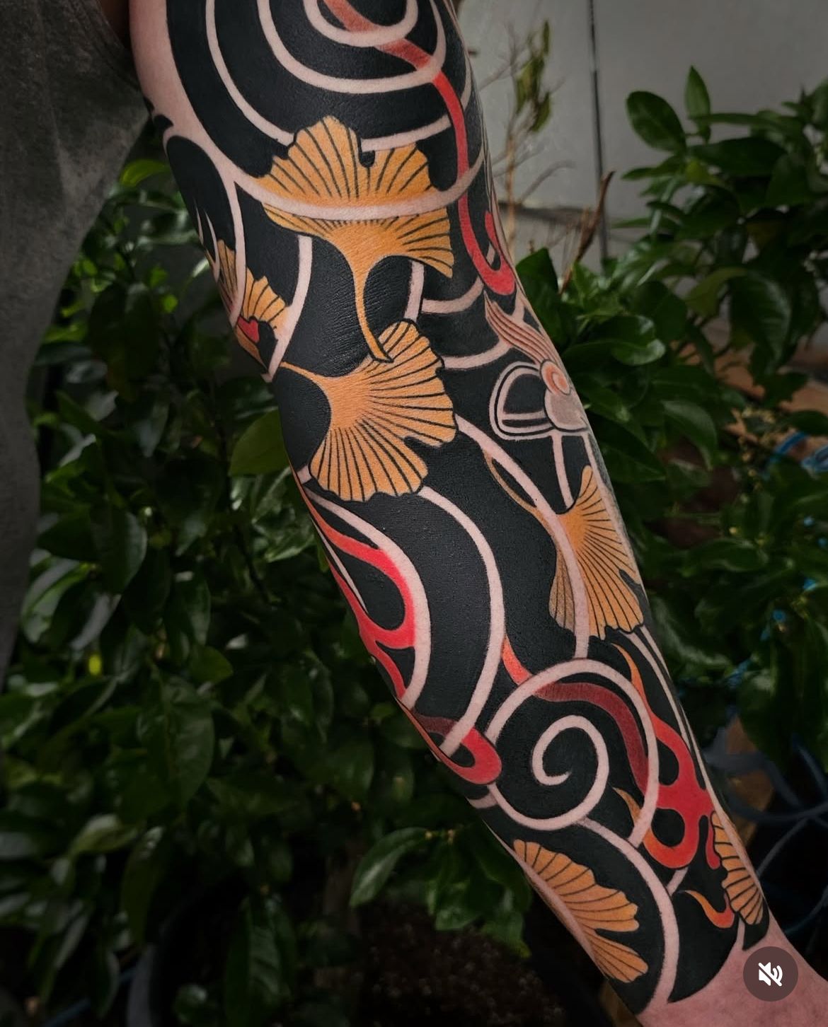This one feels like wearable design—sleek, graphic, and honestly kind of hypnotic. The flow has that “I have my life together” energy, even if you’re running on coffee and optimism. Those ginkgo shapes bring a calm, elegant softness, while the bold background and crisp curves keep it edgy. It’s the kind of Japanese tattoo design choice that looks polished with a blazer but still hits hard with a tank and jeans.