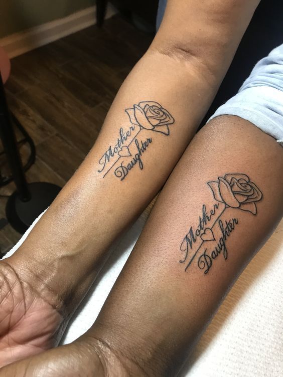 This matching idea is great if you’re looking for something small that exudes a whole lot of soul. This Fine Line script tattoo is stunning on the forearm, where a small tattoo will complement any body type. This tattoo design is ideal if you’re a mom and daughter duo looking for distinctive, small, and meaningful tattoos that can easily be hidden at work but showcased on the weekends when the sleeves come rolling down.