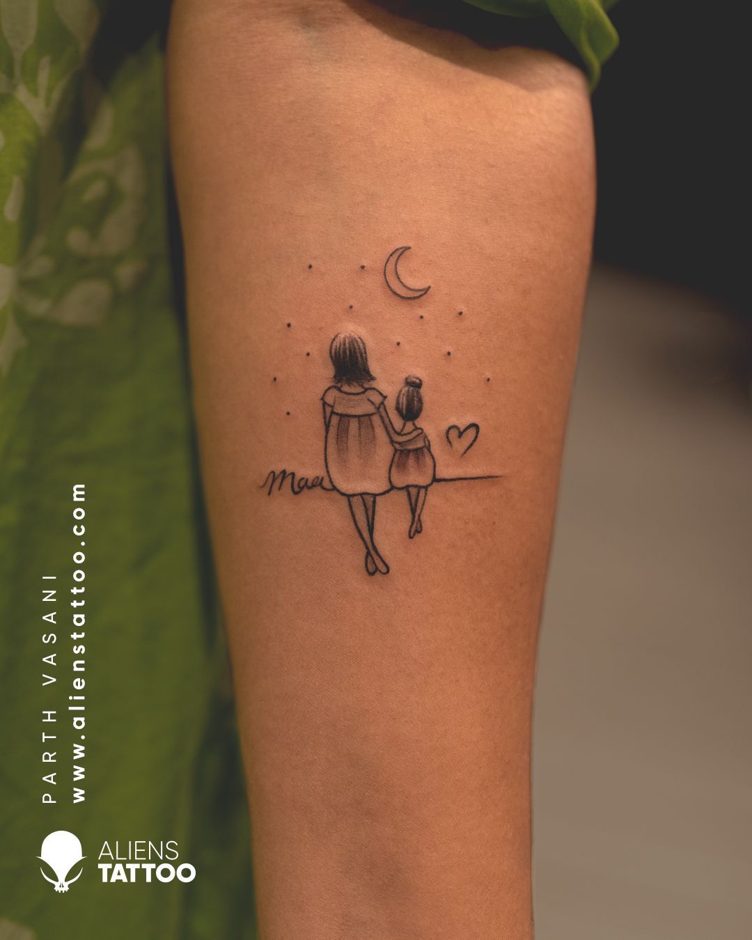 This little scene of a mother and daughter sitting together under the moon feels like a love letter to all the late-night talks you’ve shared. The tiny stars, the crescent moon, the simple outline of two figures leaning in—it all captures that feeling of being each other’s safe place, no matter how old she gets. It’s one of those cute tattoos that stays deeply meaningful without needing a lot of detail or color.
