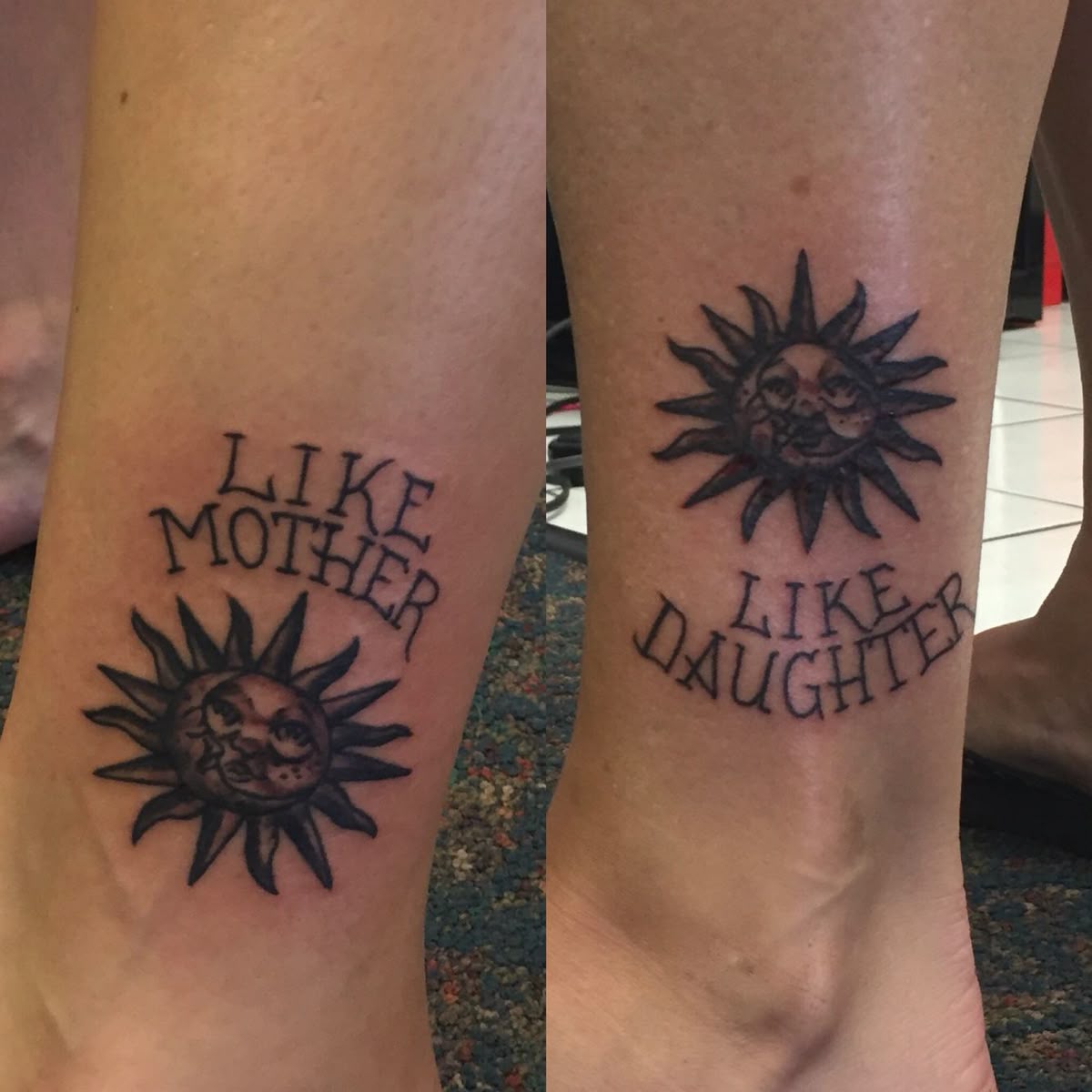 These little suns with serene faces and the words “Like Mother” and “Like Daughter” feel like tiny talismans guarding each step you take. The rays flare out in confident spikes, almost like a crown, hinting at all the strength and warmth you share. It’s the kind of design that makes you think of early-morning talks, beach vacations, and every time she’s been your light on dark days. As mother-daughter tattoo ideas go, this one is quietly powerful, with just a touch of mystical charm.