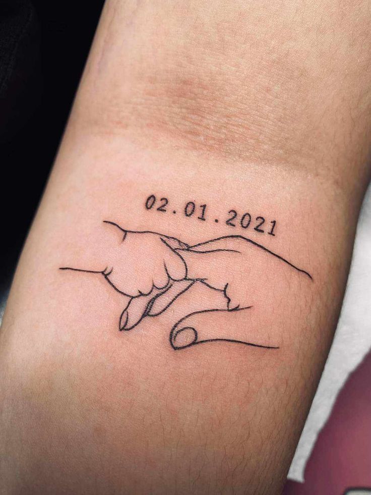 Often one moment in time changes everything—which is her birthdate, adoption day, or a great achievement that we both worked towards as a couple. This minimalist tattoo design encompasses this with a small date stamp and a fine-line sketch of a small hand grasping a large hand. It is a subtle, sweet, and oh-so-powerful tattoo that looks like a small photo of the day I received life as a mother myself. This is a mother-daughter matching tattoo idea that speaks to a moment in time that is acutely meaningful in a subtle way that doesn’t scream “we match.”