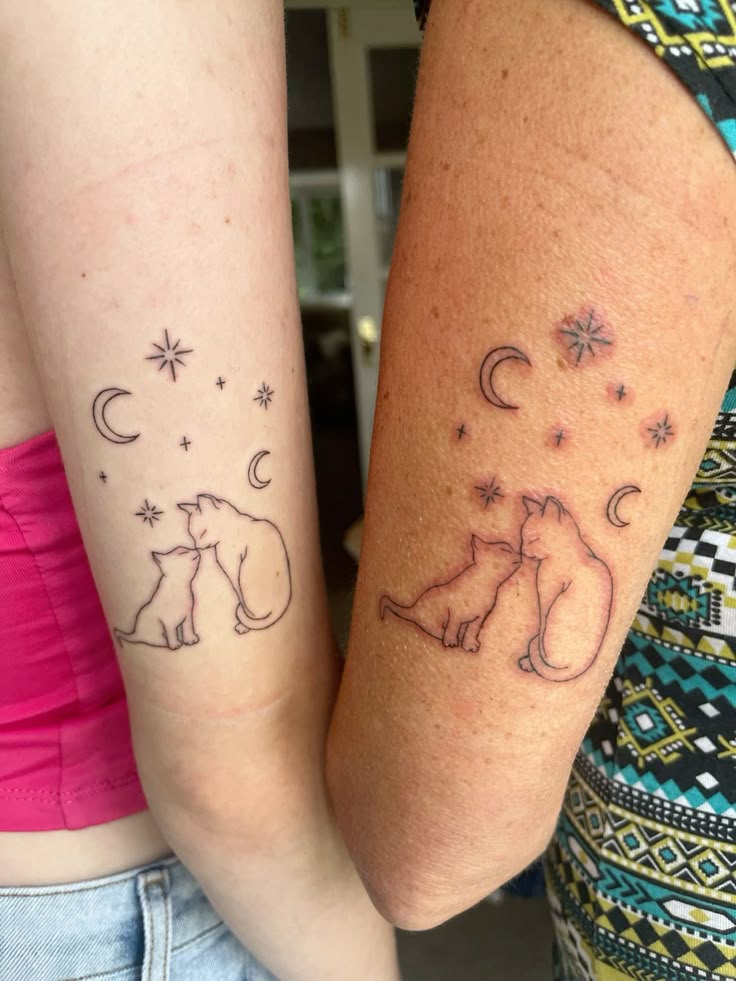 As night owls, cat enthusiasts, or simply a couple that loves to indulge in exceptionally long conversations deep into the night, these cats snuggled under the stars are what you’ve been looking for. A combination of the full moon and the sparkles in this tattoo will mix this particular vision of the night in a way that will ensure that this is a protective haven of a universe where things are always safe and where individuals are free to be themselves. Think of this as the push I’m giving you to finally schedule that appointment. This fine-line piece of artwork keeps the cats small and dainty, making them ideal for women who like tattooed artwork that isn’t too in-your-face but means something. It looks even better if you’re able to incorporate your initials or a date or even use a Celtic design concept inspired by constellations if that’s what resonates with you as far as heritage. It’s been 3 years since you’ve been looking at mom and daughter tattoo designs—let this one be the one that restored me to life, inspiring you to get in the chair.
