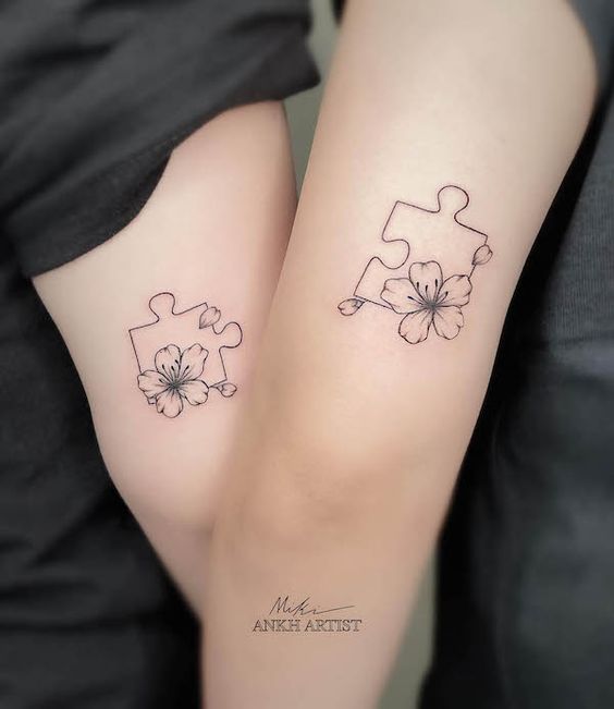These puzzle piece tattoos are such a sweet way to say, “You’re the part that makes me whole.” Each half carries a delicate flower, and when you stand side by side, the pieces visually click together. It’s a simple matching idea that still feels sophisticated, perfect for mothers and daughters who share a close, almost best-friend bond. The minimal lines and soft floral shading keep everything light and airy rather than overly bold.