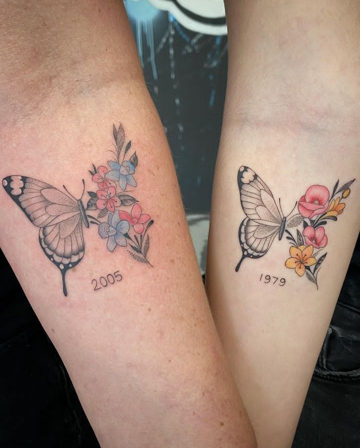 Three little butterflies fluttering up the wrist can say so much about how your relationship has grown—one stage for childhood, one for all those in-between years, and one for the woman she’s becoming. The movement in the wings gives these mother-daughter tattoo ideas a light, airy feel, almost like the two of you are always in motion together, even when life pulls you in different directions. It’s subtle, graceful, and still wonderfully matching.