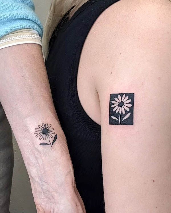 It feels like a nod to the simple experiences you’ve shared as a couple—your coffee dates, Target runs, and conversations that stretch late into the night in the car. It’s a positive, distinctive, simple way of showing that you and your daughter come from the same stock, even if your personalities develop a little differently in terms of what blooms. The look here is understatedly bohemian and thoroughly contemporary. The small flower on one sleeve is great if you like small, distinctive jewelry, while the stronger square of color on the other sleeve is a graphic treatment that will suit the daughter who prefers a stronger visual statement. “Together, they “look like a pair of perfectly matched tattoos that scream uniqueness,” until side by side, where “the family is obvious—like yours.”