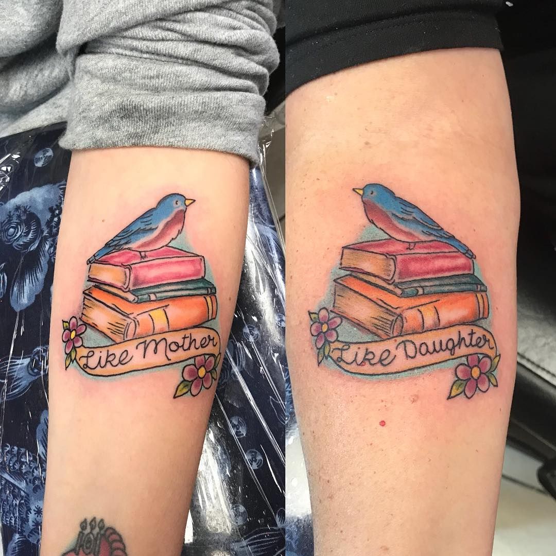 This colorful bird sitting atop a stack of books is a great tattoo idea that will speak specifically to the mom in your life who won’t stop reading until her voice is hoarse—and also to any of her daughters who never enter a bookstore without leaving with a new purchase under her arm. “Like Mother” is inscribed on one of the banners, with “Like Daughter” on the reverse. A great way to commemorate the powerful bond of family that comes with a shared appreciation of reading is this storybook bird tattoo.