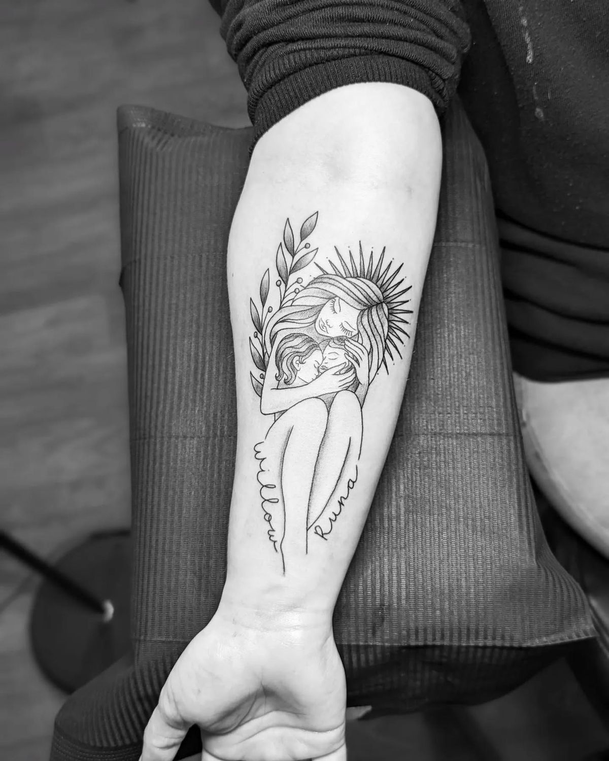 Given the fact that the lines are so clean and the details in the shading are subtle, this tattoo will indeed benefit from great aftercare and moisturizing techniques in order to keep everything as sharp as possible. So be sure to request that the artist use a fine-line tattooing approach in this design, as well as a minimal use of color, if you are a fan of cute, feminine tattoos that look great on the forearm. A small application of lotion each day will help keep this sweet, powerful moment looking as fresh in ten years as it does in the first.