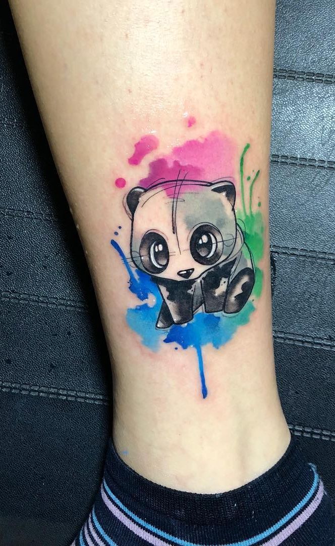 Current trends: colored auras behind blackwork animals are having a moment. Keep the panda realistic-light with fine-line edges, then push the background for drama. Great for design for women who want color without losing clarity.