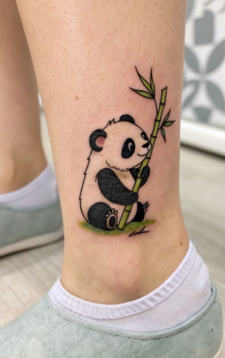 Styling tips: ask your artist for crisp fine-line outlines with gentle dot shading in the fur to keep it light on the ankle. A light green glaze on the bamboo adds pop without overpowering the black. Healing is easy—unscented moisturizer, no tight socks, and SPF later to protect the design.