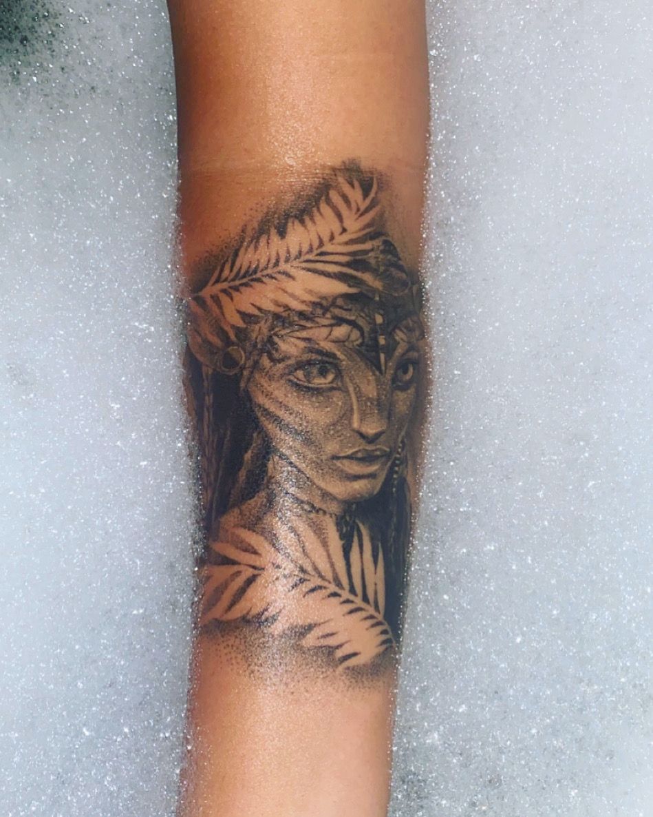 If full color feels a bit too loud for your everyday style, this monochrome Na’vi forearm tattoo is a beautiful alternative. The delicate shading, leafy crown, and calm gaze give it this quiet, mystical energy—like a guardian from Pandora watching over your morning coffee runs and late-night emails. It’s subtle enough to peek out from under a blazer but still clearly rooted in that navi world of intuition, nature, and feminine power. Think of it as an avatar tattoo made for grown-up life, not just fan conventions.
