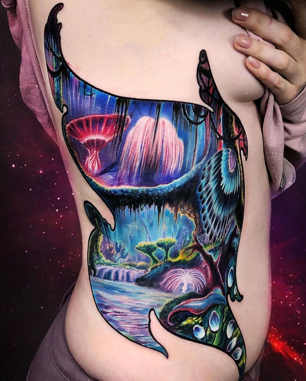 This ribcage design is a full love letter to Pandora itself—no characters, just pure glowing landscape. Waterfalls shimmer in neon pinks and blues, strange trees bend over luminous rivers, and the whole scene feels like it’s pulsing with quiet life. It’s the kind of avatar tattoo that turns your side into a secret window, like you could lift your shirt a little and show a friend this hidden, enchanted world. There’s something wonderfully feminine about placing a whole ecosystem along your curves, like carrying an inner jungle lit by Eywa’s touch.