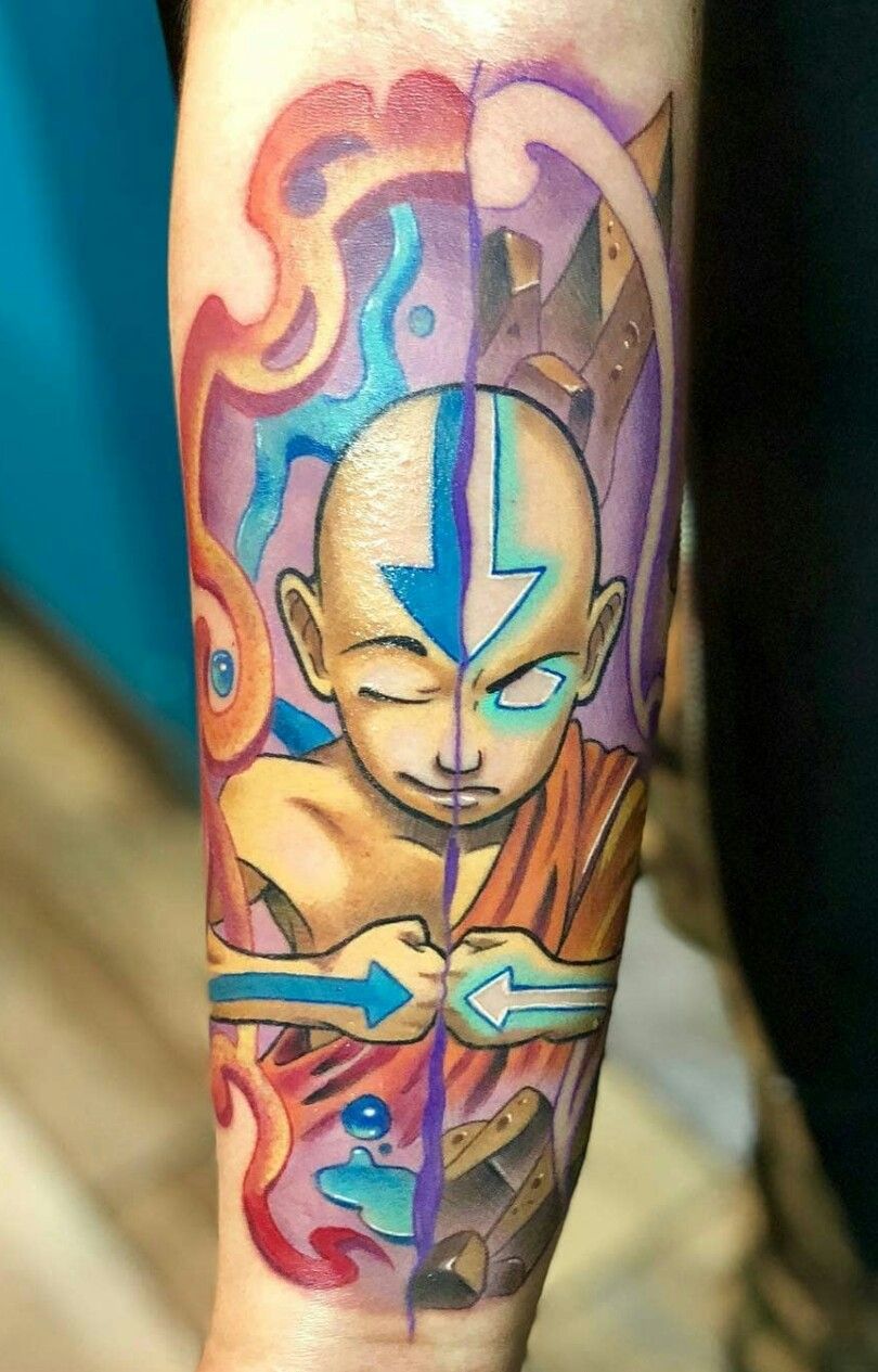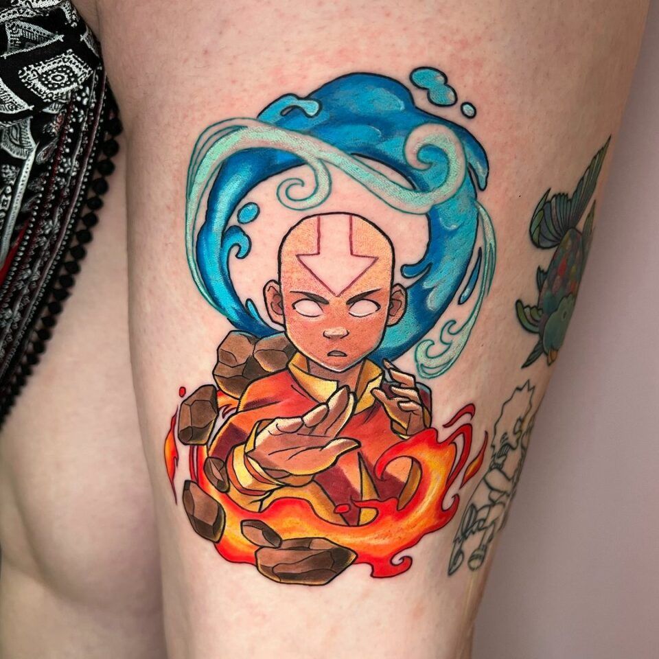 This playful thigh tattoo takes the heart of the last airbender and wraps it in color. Aang stands at the center, eyes glowing, surrounded by swirling water, jagged rocks, and dancing flames that curl around his body. It captures that perfect balance of innocence and power—the same feeling you got watching him grow into the Avatar while learning from mentors like the last airbender Iroh. It’s bright, hopeful, and just a little nostalgic, like a favorite comfort show you rewatch on hard days.