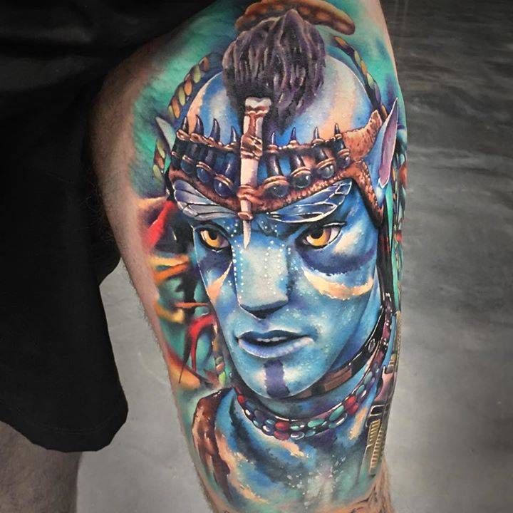 This avatar tattoo feels like slipping on invisible armor every morning. The Na’vi warrior’s intricate headpiece, the painted stripes, and the intense gaze all radiate “I know who I am, thank you very much.” The colors are wild—in the best way—layering jungle greens with electric blues and ember reds so the whole design feels alive, like a battle shot from Pandora frozen on your skin. If your life has had a few plot twists and you’ve come out stronger, this is one of those ideas that quietly celebrates that journey.