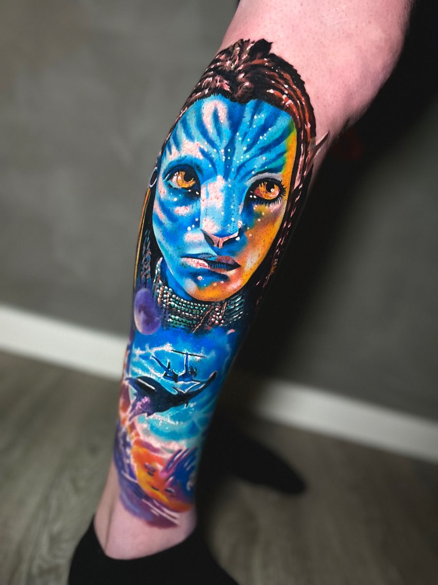 This full lower-leg avatar tattoo is a pure Pandora daydream. A luminous Na’vi face anchors the design, while below her, moons, oceans, and sleek silhouettes of Ikran sweep across the calf. The colors shift from deep cosmic purples at the top to turquoise waters at the bottom, like your skin is literally fading into an alien seascape. It has that feeling of standing on a cliff at dusk, wind in your hair, ready to leap onto a Pandora ikran and trust the ride. For anyone craving a tattoo that feels like escapism you can carry into the office, this is it.