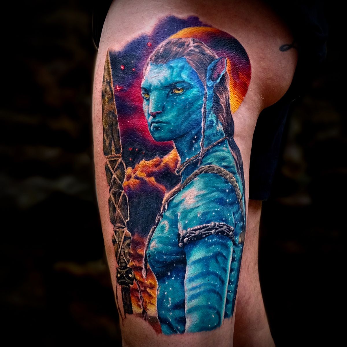 This thigh tattoo channels Neytiri energy in the best grown-woman way—strong cheekbones, focused gaze, and those tiny bioluminescent specks that feel like stardust on skin. The deep teal shadows and warm gold around the eyes make the whole piece glow, even when you’re just in gym shorts or sleepwear. It’s one of those avatar tattoo ideas that celebrates courage and instinct, like wearing your own warrior queen from Pandora wherever you go.