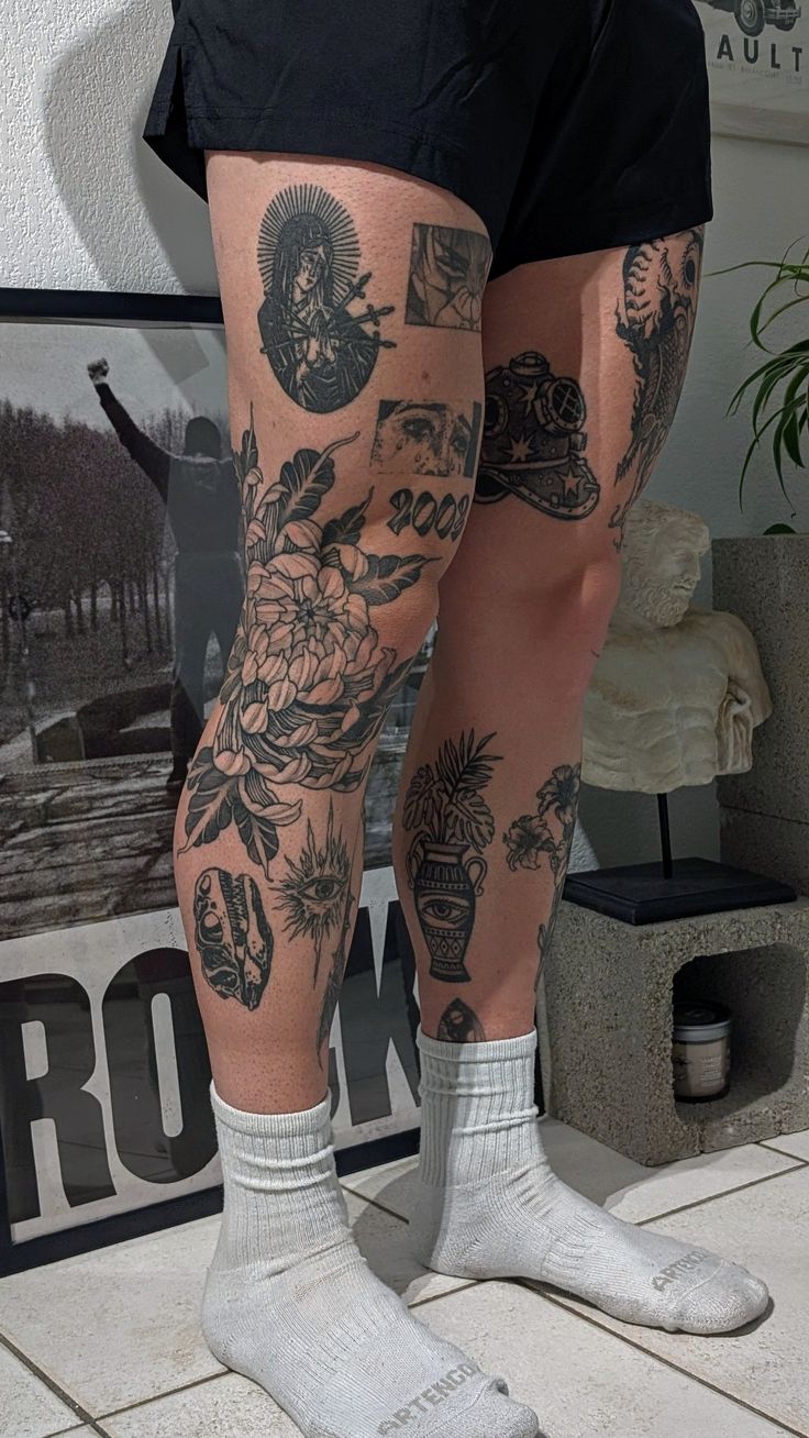This patch of black ink arresting artwork is akin to a visual diary etched into the very soul. Saints, flowers, numbers, and eyes: each pictures its own narrative, yet the whole respects a louder one of identity and strength. It is defiant and dramatic, a tattoo that throws away all minuscule rules to make its own big-banging sound.