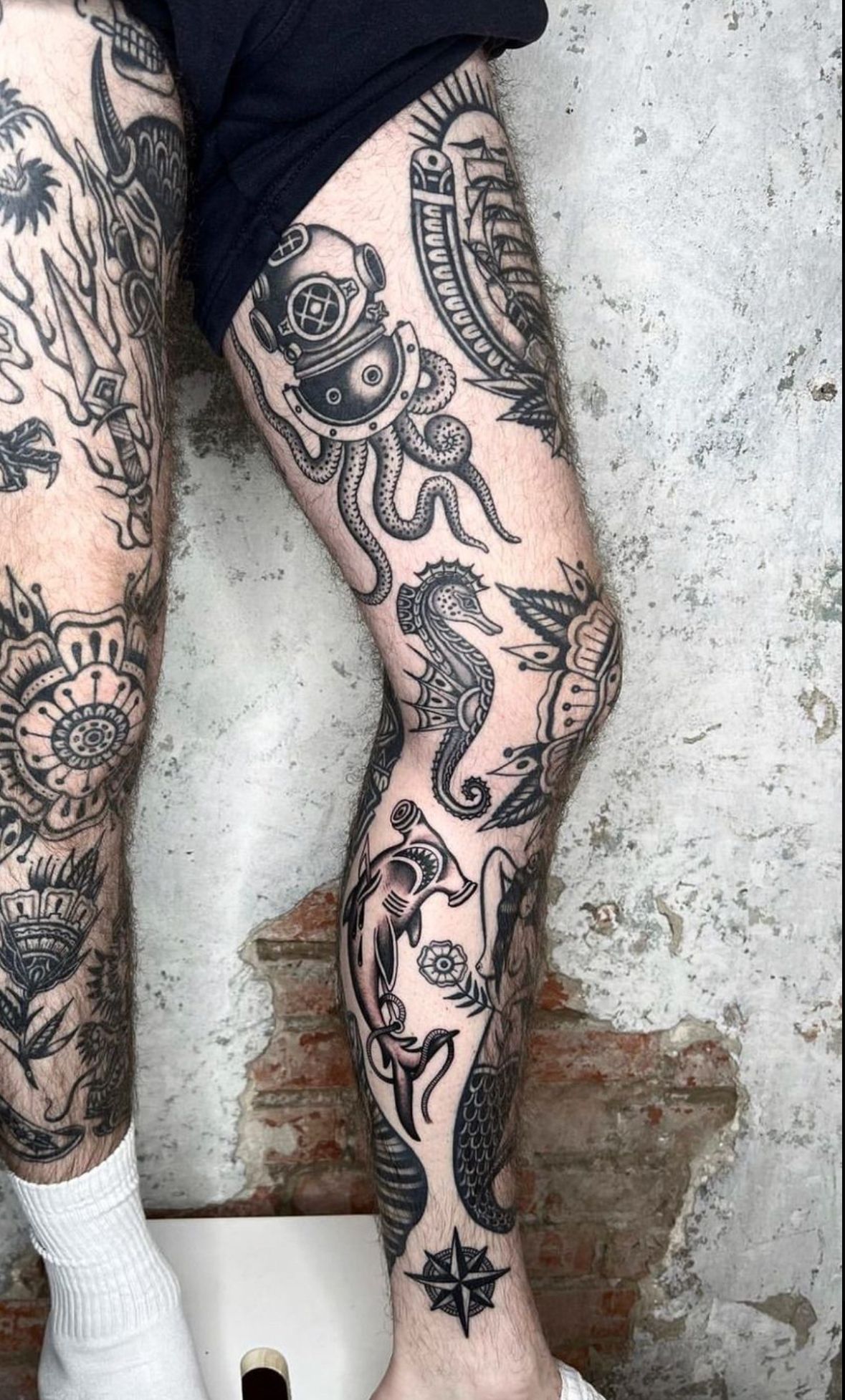 This full leg sleeve gives a complete ocean-side experience-the diver’s helmet, sea creatures, and compass navigating through the depths of life. This playful and powerful tattoo is brimming with detail and character. Every curve narrates the story empowered by strength and curiosity, with courage to explore the unknown.